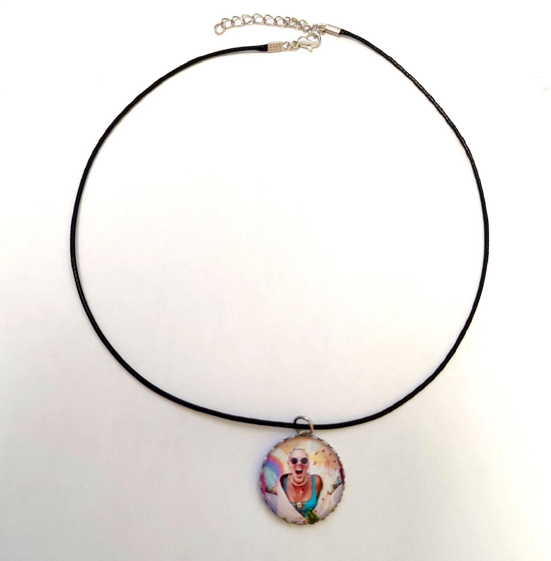 Présenté ici avec son cordon en simili cuir, longueur réglable.